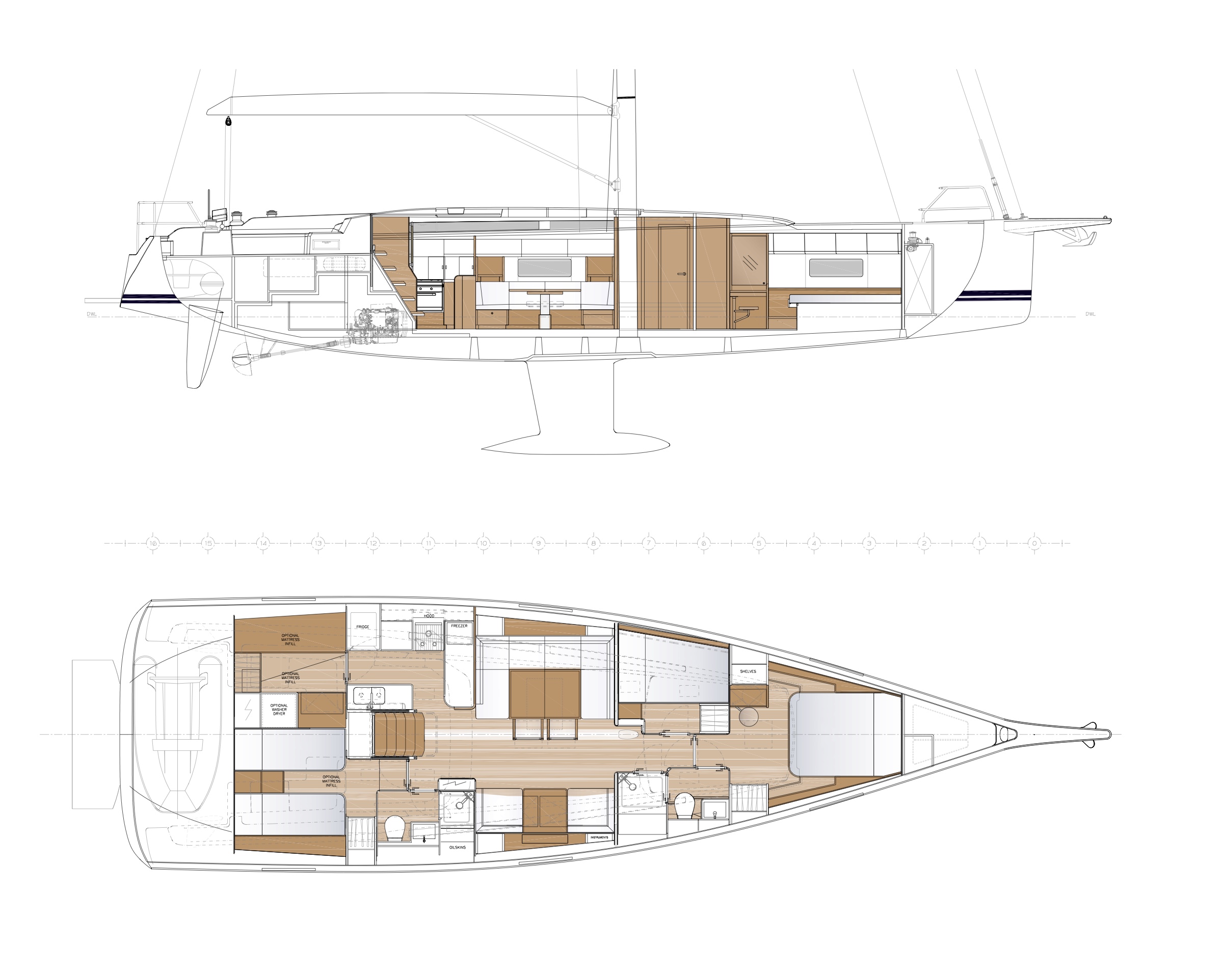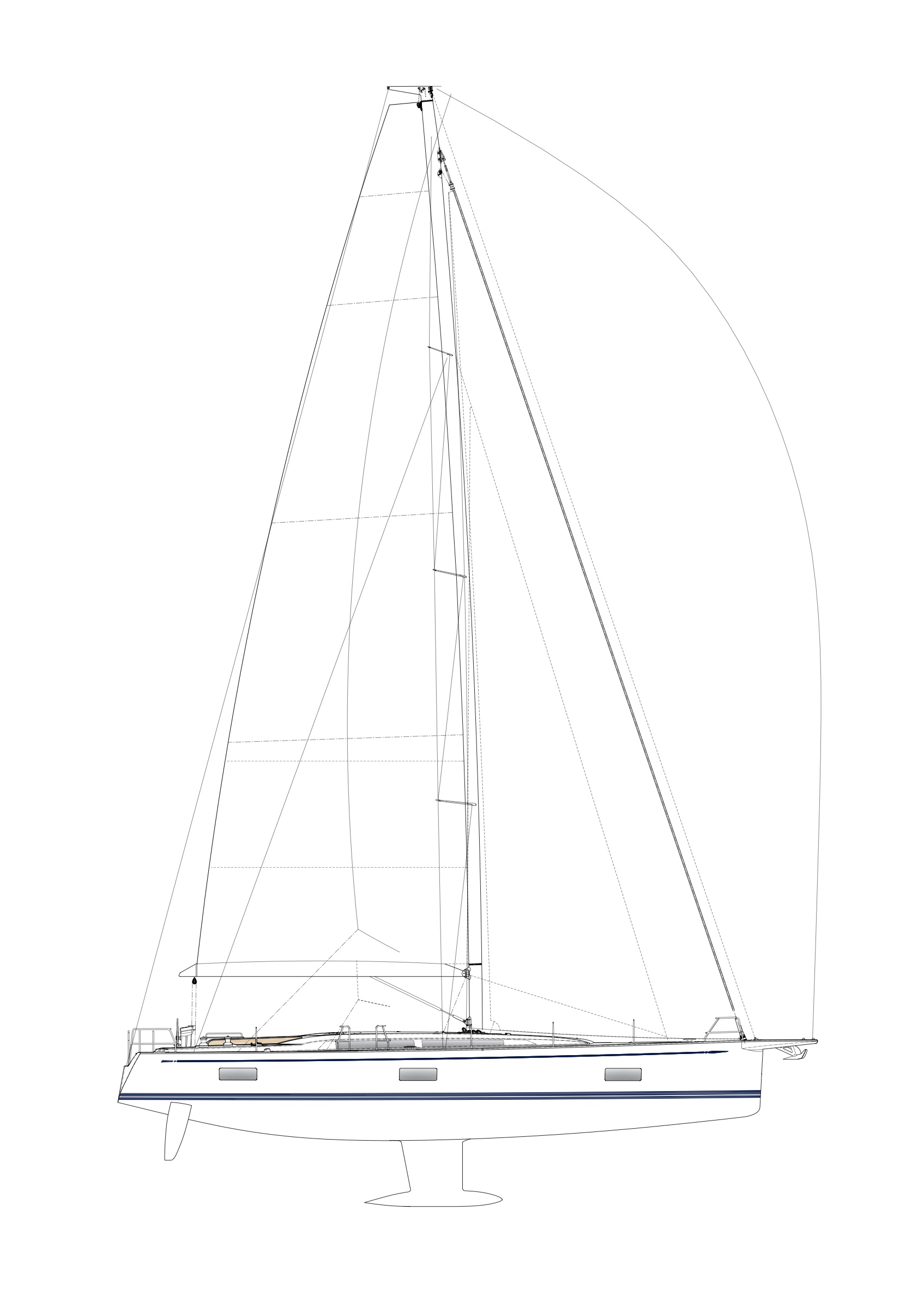 She will be a pleasant yacht to sail, easy to handle and cruise in its standard version and race in in its performance set up version, which includes a square top mainsail and a bowsprit for the light weather and downwind sails.”