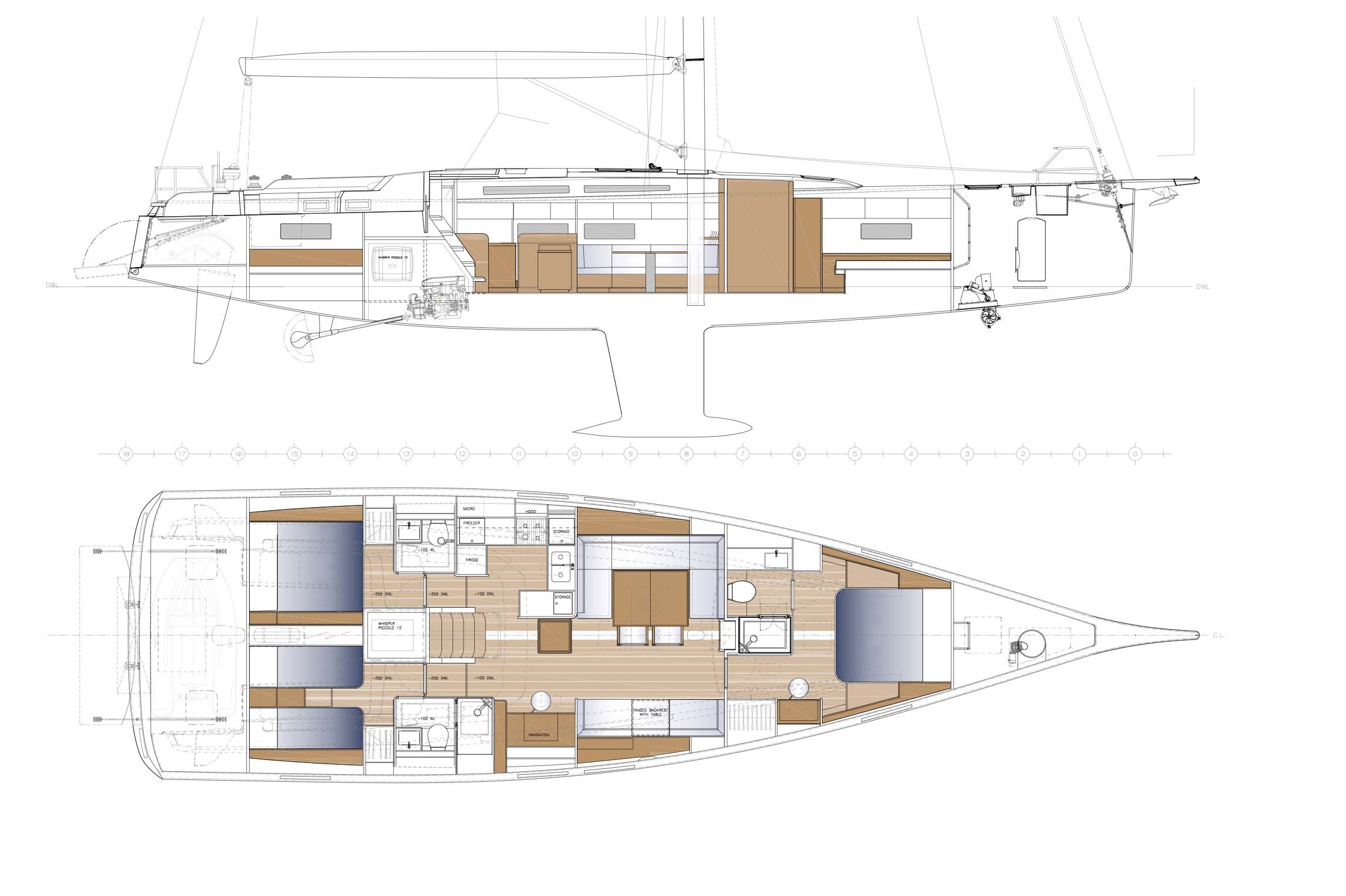 Designed for proper bluewater cruising, the 58 interiors have been conceived as a combination between luxury and comfortable living spaces, storage and volumes for systems and safety features. The standard layout offers three guest cabins and three heads, with the possibility to add a guest/crew cabin amidships and an extra crew cabin with wc and sink in the forepeak. The 5 + metre long saloon has plenty of natural light and ventilation, with overall headroom above 2 metres and great views through the large hull windows. The dinette crosses the whole beam, offering a dining area which can seat up to 10 people and a table that can vary its size according to use, facilitating access to the whole seating area. On the starboard side, an array of possible combinations allows the owner to personalise this area to suit their needs. The galley is designed to be practical at anchor as well as under sail, with a 360° design that gives support while heeling and plenty of work surfaces accessible both inside and outside the galley. A special cabinet is dedicated to tableware, complete with a removable tray to facilitate the storage of delicate china on board. The navigation station is offered in five different layouts, from the traditional forward-facing chart table to the office-like desk complete with seat and drawers. The forward cabin provides owners with a proper suite where they can enjoy private time without compromise. The bed is oversized (205×165 cm) and complete with 3 integrated removable leeboards that allow its use while sailing; it is fully accessible on three sides. Guests have two en-suite cabins available, offered with two possible layouts: two separate beds or one generous queen size. Throughout the boat, storage volumes are available in different shapes, from drawers to lockers to below-seat volumes, to allow for better organisation of provisions and personal belongings and make your cruises problem-free.